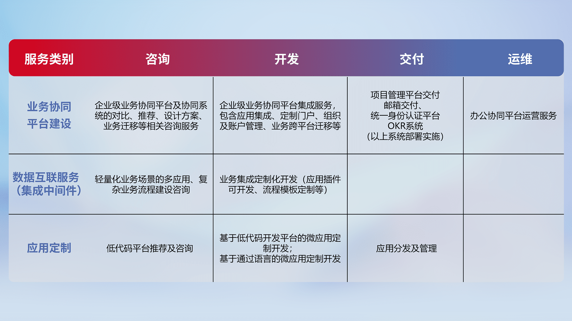 针对钉钉、、、、企微、、、IDaas等平台级产品提供产品的规划、、、方案、、、、交付、、、、定制化开发等服务,,,,实现如统一协同办公、、、、智能客户服务、、混合会议管理、、、智能数据查询、、等业务场景,,,实现数字化转型。。
